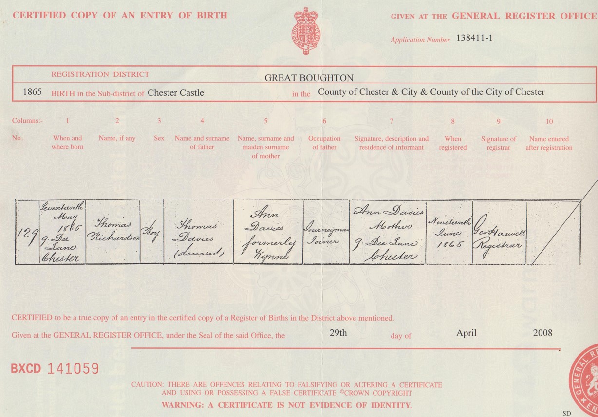 Davies, Thomas R. 1865 - 1866 of Chester Family Tree, 99+ Hints, 55 people, 23 Sep 2018, 6 Jun 2022 Richard Davies
