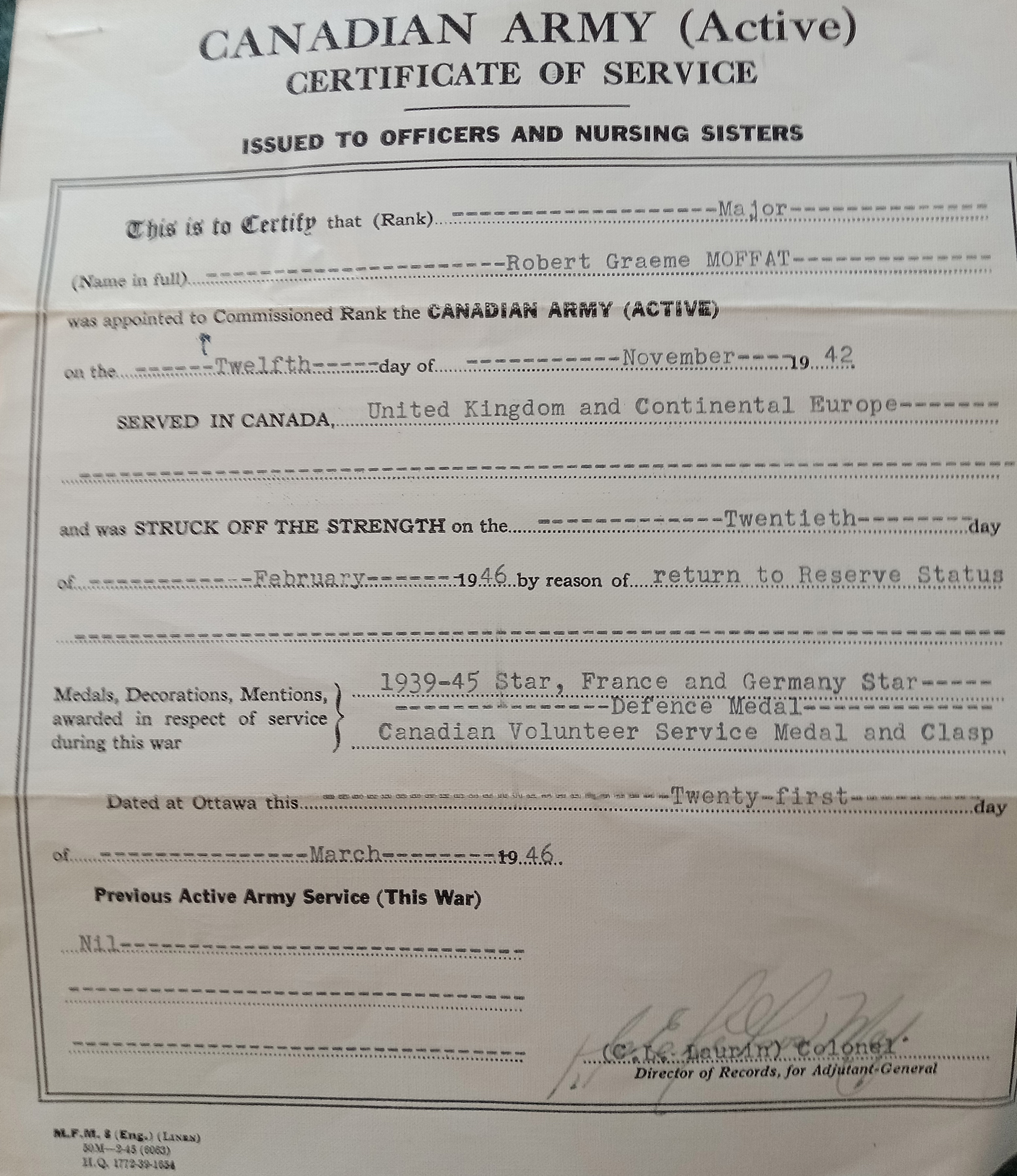 Harvey Moffatt appeared in the 1921 Canadian Census of Clarke Twp., Durham County, Ontario in the household of his parents, David and Agnes Moffatt.7