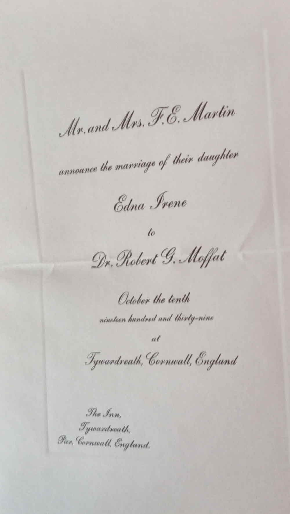 The engagement of Frances Enid Williamson and Rev. Alex T. Moffat was announced by E. B. Williamson and Mrs. E. B. Williamson on 2 April 1943 in the newspaper the, Star-Phoenix, Saskatoon, Saskatchewan, Canada.11