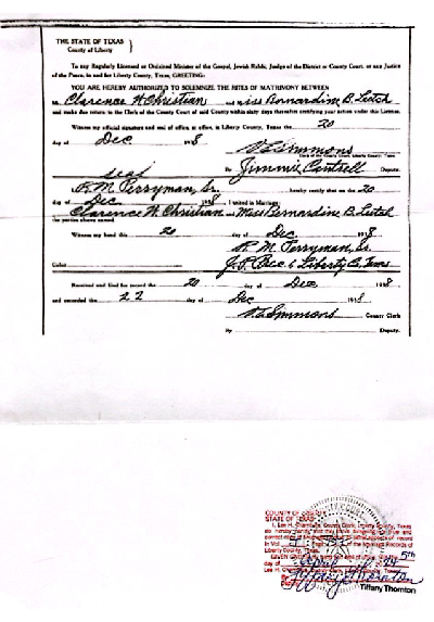 | Marriage* | Clarence married Bernadine B. Leetch on 20 December 1938, Liberty County, Texas, USA.13,3,4,14,5,15,12,7,16 |