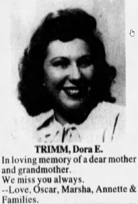 In the obituary of Jack Trimm who died 31 May 1987, his wife, Dora Trimm, was listed as a survivor.4