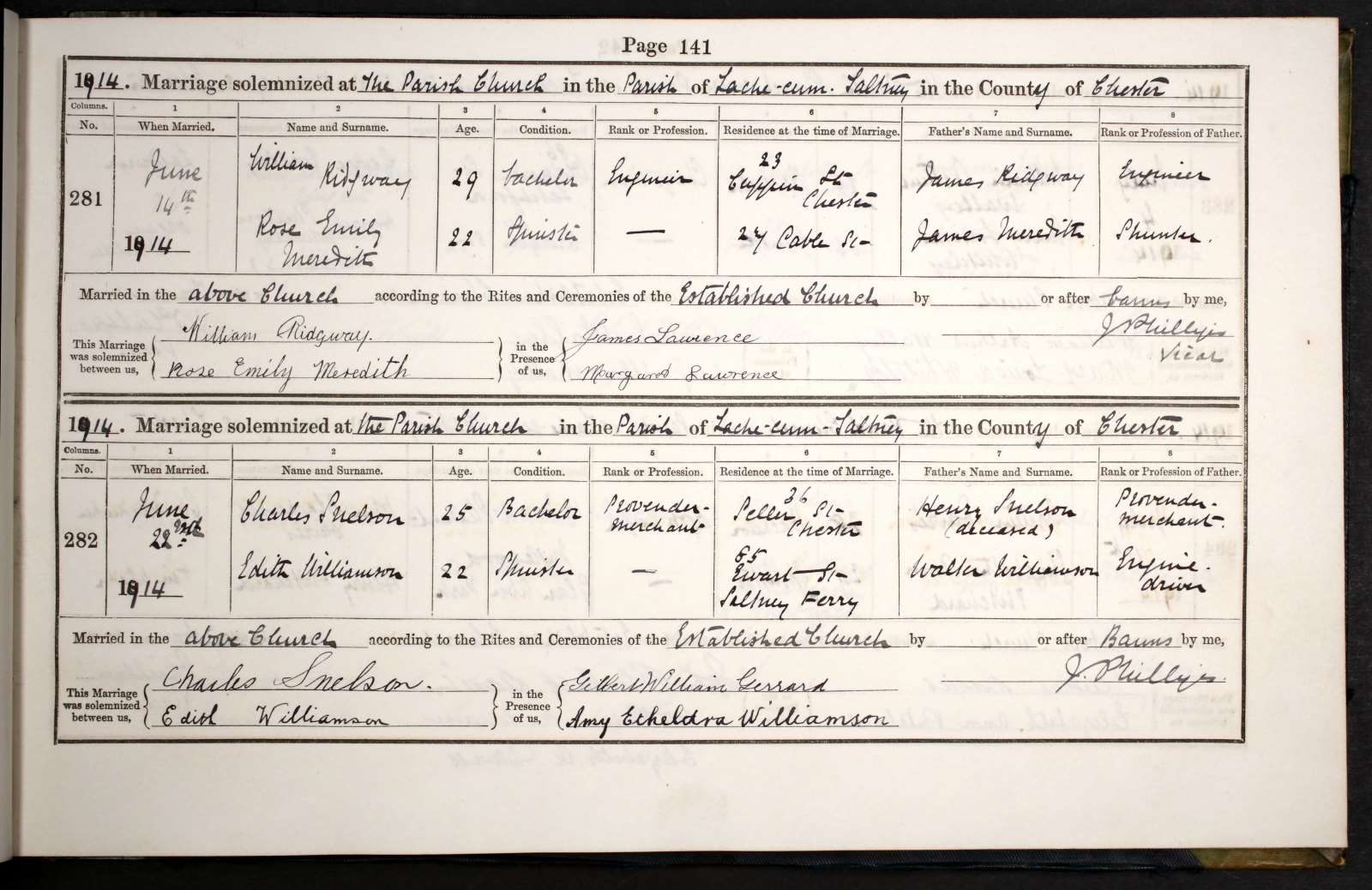 Marriage 1914 Cheshire Charles Snelson Edith Williamson