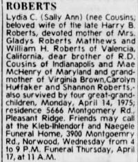 ? She was listed as a resident in John A Cousins and Eliza Jane Cousins's household in the census report on 1 June 1900 at Pine Twp., Armstrong, Pennsylvania; Also listed on this census is Etta Cousins, age 3 birthday Oct 1897, grand daughter (of John.)1 As of circa 1910,her married name was Roberts.2,3 Lydia Cousins appeared on the census of 4 May 1910 at Madison, Armstrong, Pennsylvania.7 She and Harry Bechler Roberts appeared on the census of 14 January 1920 at 322 W Fourth St, Cincinnati, Hamilton, Ohio.8 Lydia Roberts and Harry Bechler Roberts appeared on the census of 11 April 1930 at 322 W Fourth St, Cincinnati, Hamilton, Ohio.3 Lydia Cousins was named an heir in the will of Eliza Jane Longstreth dated 13 August 1930 at Dee, Armstrong, Pennsylvania.9 Lydia Roberts and Harry Bechler Roberts appeared on the census of 27 April 1940 at 2311 Kemper Lane, Cincinnati, Hamilton, Ohio. Also living with household was Marie Polley, b 1911, a lodger.10 Lydia Cousins lived on 30 May 1959 at Cincinnati, Ohio.11 She lived on 25 January 1962 at Cincinnati, Ohio.12 As of before 1975, Lydia Cousins was also known as Sally Ann Roberts.5