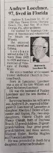 - [S126] Find-a-Grave.com Obituary, Various, Find a Grave, database and images (https://www.findagrave.com: accessed 02 March 2021), memorial page for Andrew Smith Loechner (2 Mar 1904–15 Nov 2001), Find a Grave Memorial no. 188652427, citing Conestoga Memorial Park, Lancaster, Lancaster County, Pennsylvania, USA; Maintained by André Dominguez (contributor 47981897).