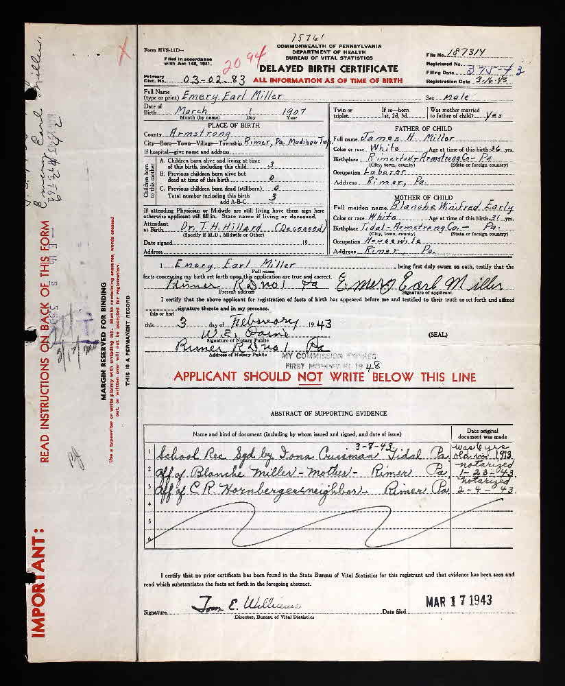 - [S29] Birth Records entry, State Registration, Pennsylvania, Birth Certificates 1906-1911 for Emery Earl Miller, Delayed Birth Certif date March 16 1943.