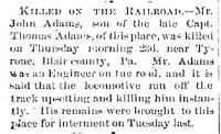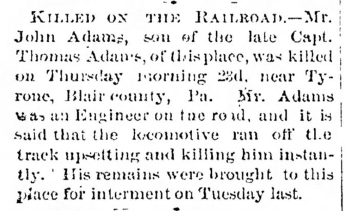 - [S126] Find-a-Grave.com Obituary, Various, Find a Grave, database and images (https://www.findagrave.com: accessed 21 April 2021), memorial page for CPT Thomas Adams (1809–9 May 1864), Find a Grave Memorial no. 126650994, citing Blairsville Cemetery, Blairsville, Indiana County, Pennsylvania, USA; Maintained by Don Ludwig (contributor 48084204).