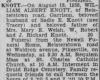 Newspaper obit: Baltimore Sun, Baltimore, Maryland, Aug 20 1958, Page 24.