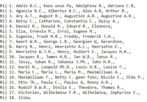 families: Albert, Alexander, Barrett, Bedier de Prairie, Bom, Campbell, Croes, De Hart, De Roode, Drossaerts, Emmen, Feijtes, Filon, Gieseke, Hanssens, Harms, Kiksen, Kloer,