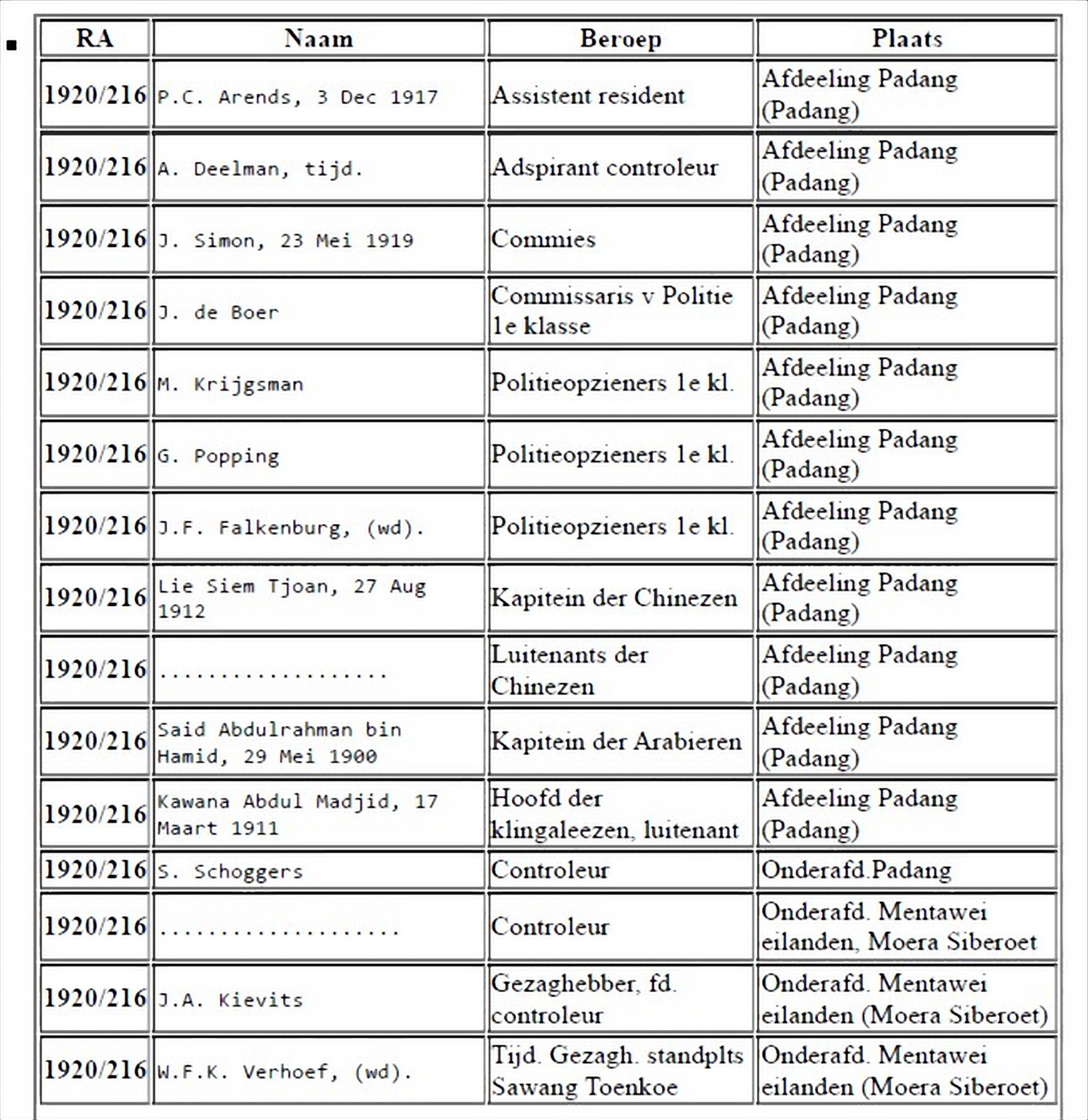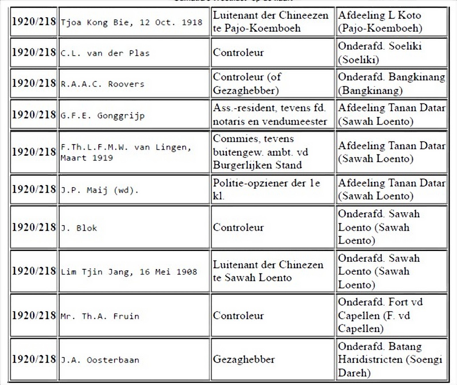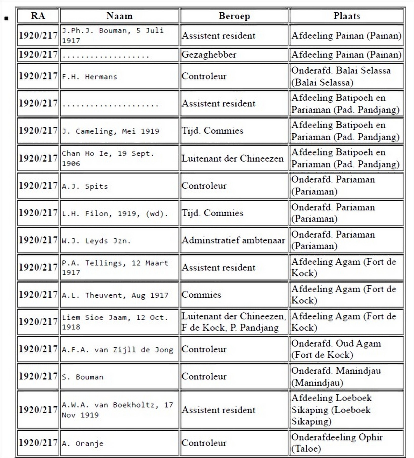 Ambtenaren Gewestelijk Bestuur uit de Regerings Almanak 1920, Bezittingen Buiten Java en Madoera - Sumatra's Westkust.