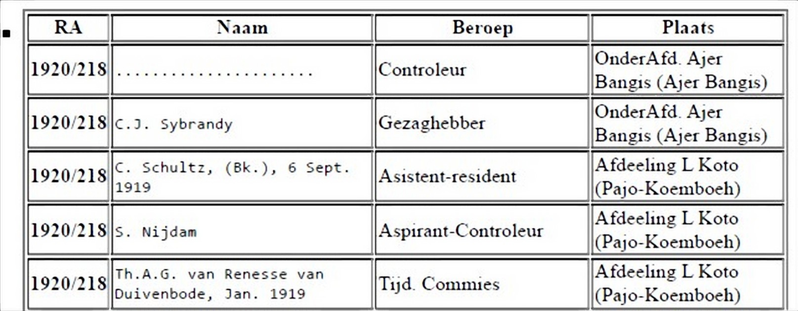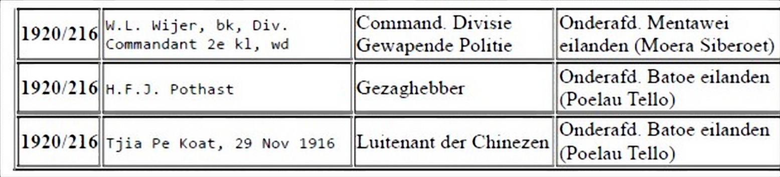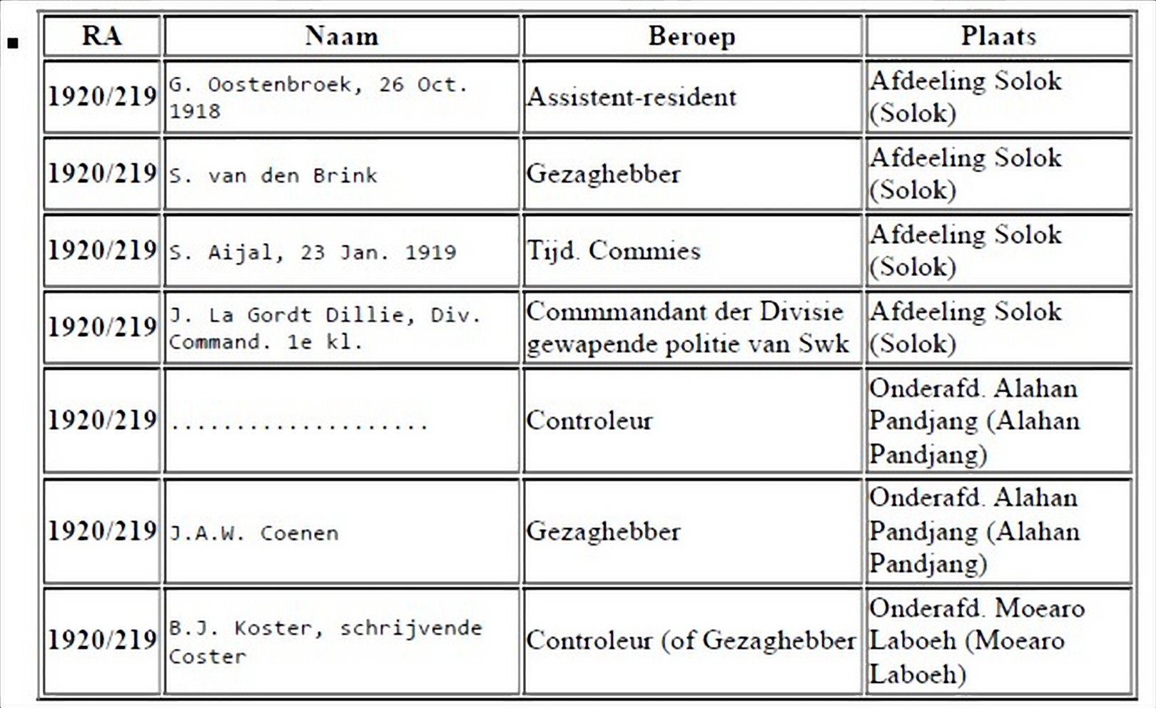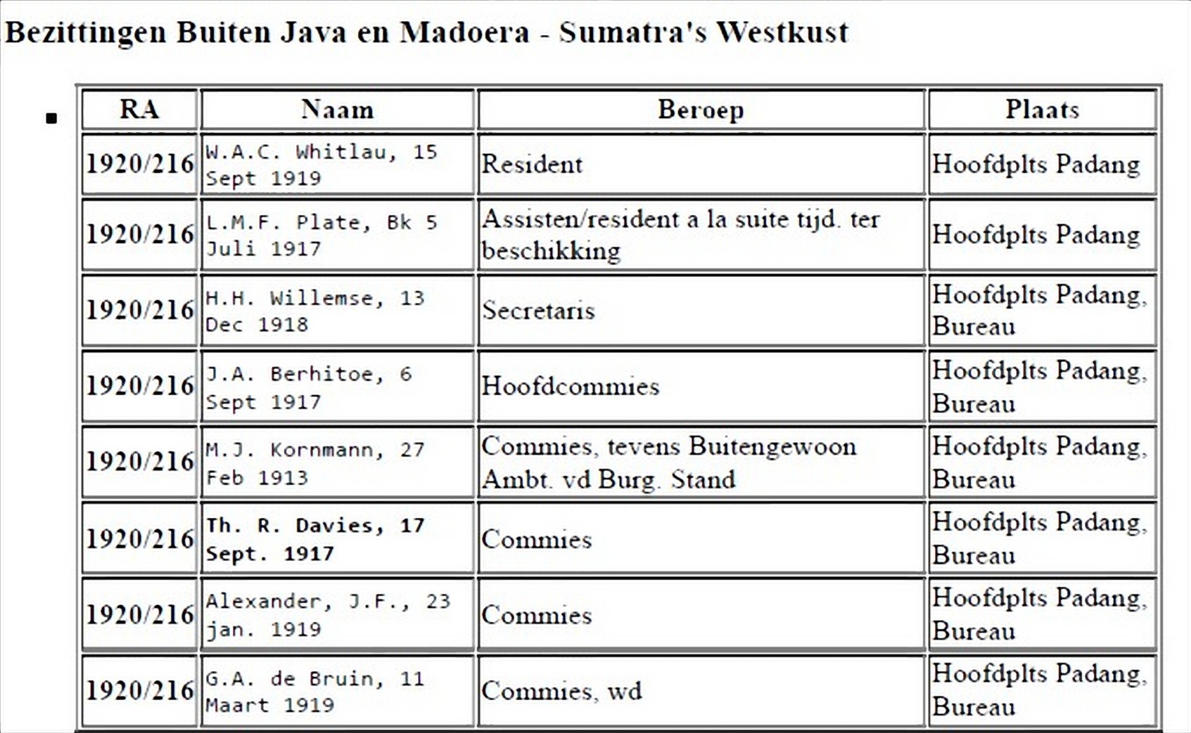 Ambtenaren Gewestelijk Bestuur uit de Regerings Almanak 1920, Bezittingen Buiten Java en Madoera - Sumatra's Westkust.