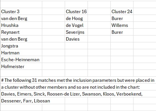 2024 autosomal matches: Hofmeister, Davies, Dessener, Schrooten (MyHeritage), Kater (Ancestry), van den Berg, Campbell, Fereria, Russo, van den Dungen (23&Me); Maidman, Willems, Leeflang (MyHeritage aug. 2024); Hartings (MyHeritage okt. 2024)