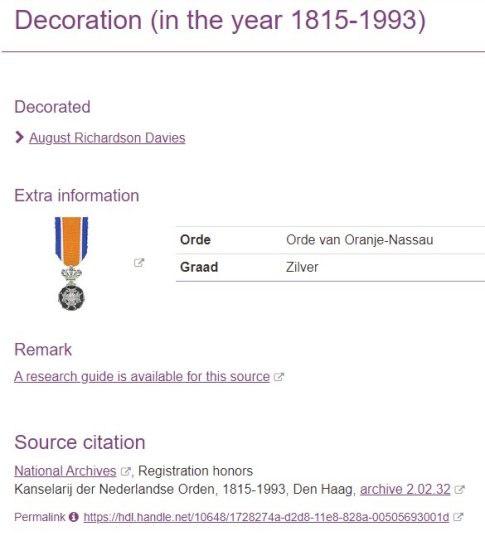 2. Kanselarij der Nederlandse Orden, 1815-1993: August Richardson Davies, Orde van Oranje-Nassau, Zilver; Thomas Richardson Davies (1886-1955), Orde van Orangje Nassau, Ridder.