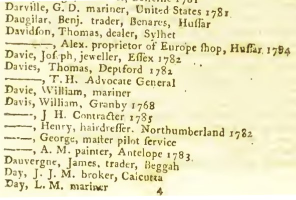1792,57 en 1792,74 The East India kalendar or Asiatic register, for Bengal, Madras, Bombay, Fort Marlborough[,] China, and St. Helena. : For the year 1792... Containing complete and correct lists of the Company's civil, military, marine, law, and revenue establishments; public offices, bankers; Greek, Armenian, Mogul, and Portuguese merchants; Company's agents at home and abroad; with a correct list of British European subjects residing in India, not in the Company's service. [year = arrival date in India]