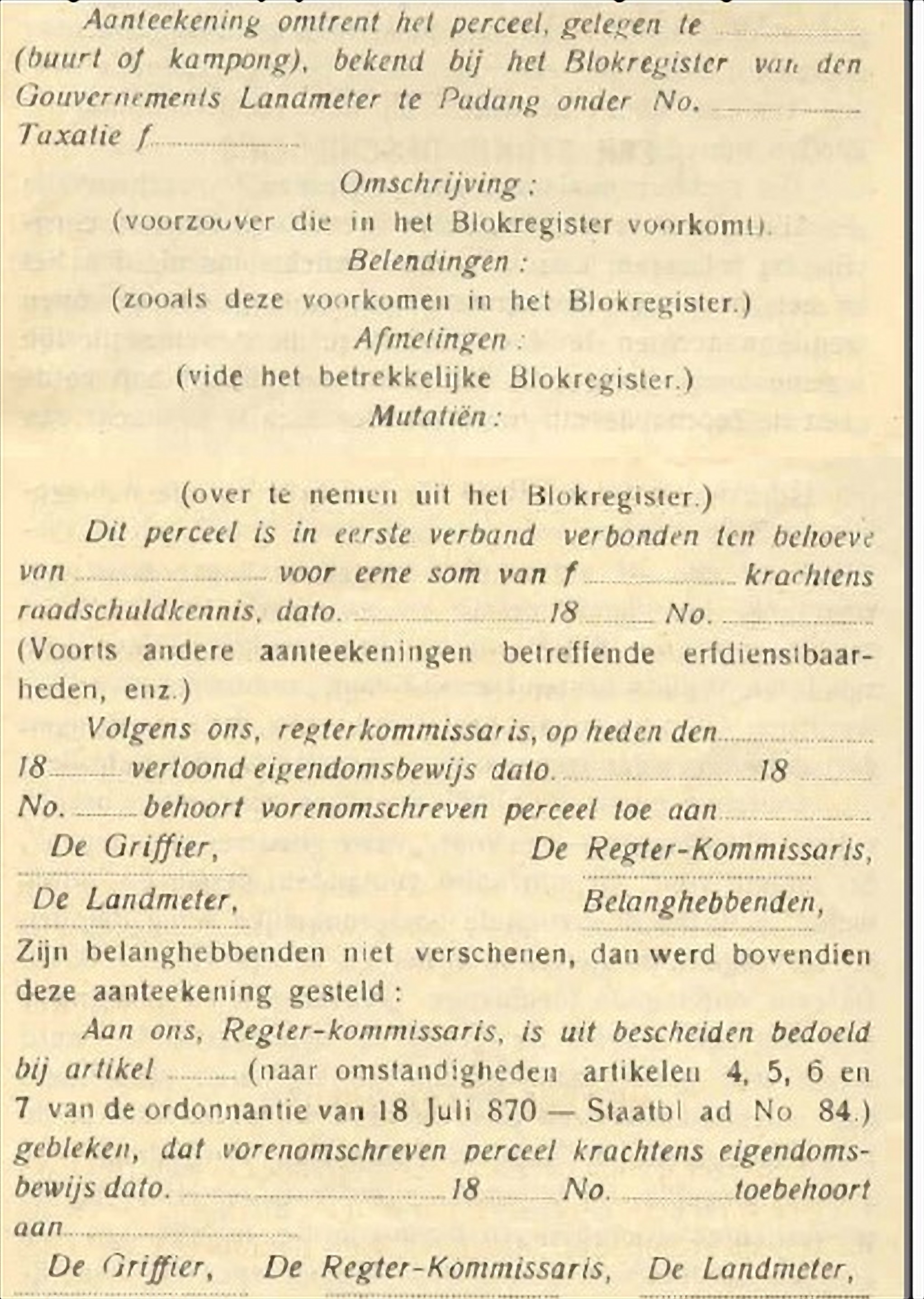 De eigenaren of houders van eigendomsbewijzen e. d. werden bij advertentie in de Javasche-Courant, de Sumatra Courant en bovendien, voor zooveel mogelijk, bij biljetten opgeroepen, ten einde bij de te verrichten inschrijvingen tegenwoordig te zijn en, des geraden oordeelende, hunne bedenkingen tegen die inschrijvingen mede te deelen. De landmeter, die daarbij mede aanwezig was, had in zijn blokregister aan te teekenen op welk folio van het brandregister het betrekkelijke perceel voorkomt. Zoo'n folio zag er als volgt uit: