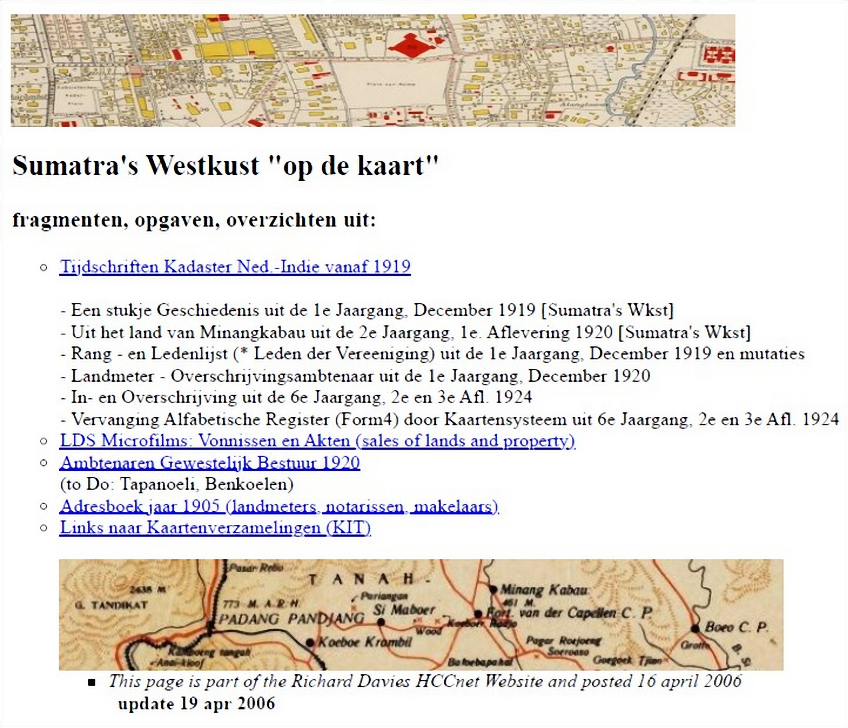 Hoe gaarne luisteren we niet met aandacht, soms gepaard met stomme verbazing, naar de verhalen van een ouderen collega, naar interessante, moppen in en uit den dienst. Nu ja, we voelen het wel, al zeggen we het niet, er komt natuurlijk een massa overdrijving bij. De een weet genoeglijk te plaudern over groote gevaren, waaraan hij tijdens zijn werkzaamheden in de rimboe ter nauwer nood is ontsnapt. Een ander verklaart met ernst, hoe hij met instumenten en al door de woedende bevolking over de grens is gezet. Doch: "Komt bij me zitten en luistert goe' lien". Opdat ik u zal verhalen, al wat ik op mijn reizenheb gezien" zou de zeeman zeggen. Maar ditmaal geen overdrijving. Het verhaal van den landmeter in ruste, hoe hij met mantri's en koelie's, met ketting en bakens het terrein werd uitgebonjourd, is historisch, gebeurd in het gezicht van Minangkabau's hoofdstad.