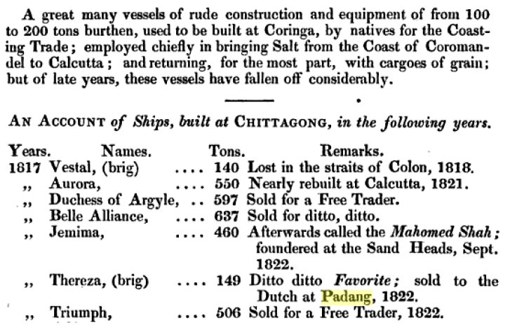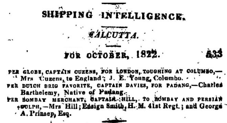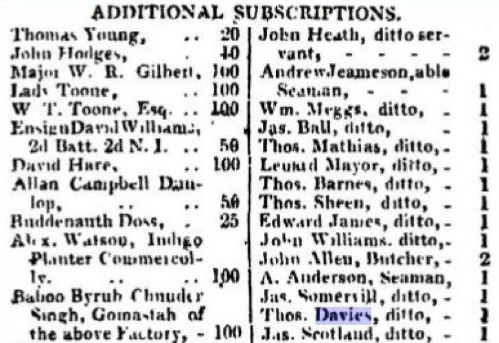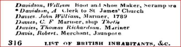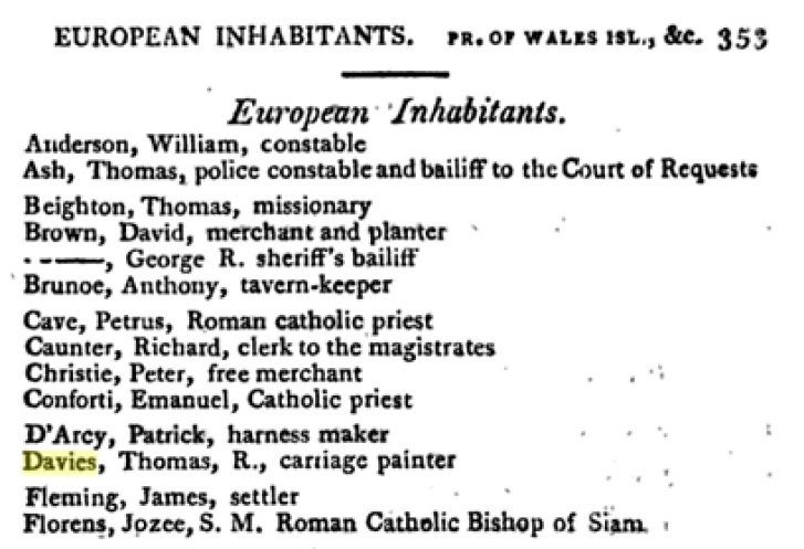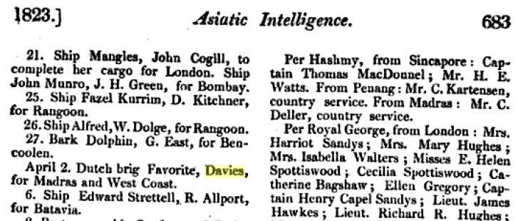 Sources bitmaps: Pr. of Wales Island Davies, Thomas R. [East-India Register and Directory for 1821 2nd Editie corrected to 28th aug. page 353]; Subscription suffering Countryman In Ireland [1822 Calcutta Monthly Journal october]; Captain Davies for Padang [1822 Shipping Intelligence Calcutta Monthly Journal Vol. 42 aug-dec 1922]; Ship building [Ship Building in India, John Phipps of the Master Attendant's Office, Calcutta 1840]; Dutch brig Favorite, Davies for Madras [1823 The Oriental Magazine and Calcutta Review, Vol. 1, Jan-Juni 1823]; Testeert [1823 CBG Centraal Bureau voor Genealogie, Collectie PH.F.L.C. Lach de Bere, bronnen over Europese families in Nederlandsch-Indie 18e-19e eeuw, doos 689 letter Davies]; Thomas Richard Davies, mariner [ New Annual Bengal Directory & Calcutta Kalender., Mariner on the list of British Inhabitants & Foreign inhabitants of Calcutta and the upper provinces of Bengal, december 31 1823]
