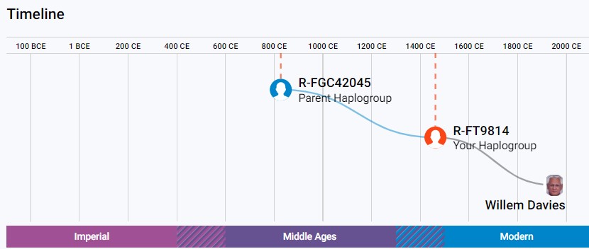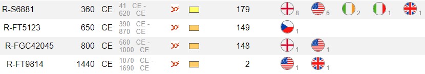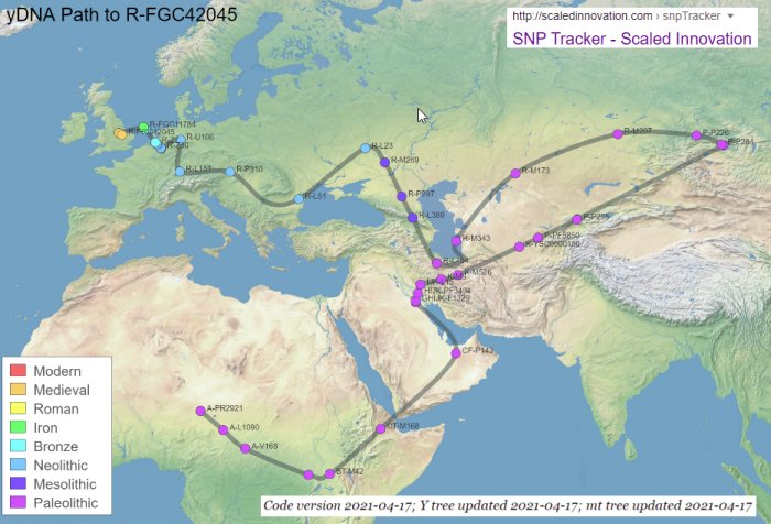 The SNP Tracker allows you to enter a SNP name (FGC42045) and to see: (1) a migration map; (2) migratory timelines; and (3) a SNP path showing chronology for each upstream SNP. The maps are intended to show where SNP mutations occurred. Most map locations are based on an average of the self-reported locations of tested men. FGC42045 end up for the time being in England aprox. 800 CE.(CE stands for “common (or current) era”, while BCE stands for “before the common (or current) era”).