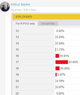 Although I've mentioned the rarity of the Welsh Tribe allele value of 13 for DYS570 before, as they say, one picture, in this case from YFull, is worth a thousand words. This not only shows their rarity among R-P312 men in "R1b", but also what their modal (most common) value is, which is 17. It also provides information to testers with other allele values about how rare their allele might be and the range of allele values that it spans. That range also contains important information about how wide it is and whether it exhibits progressive or regressive tendencies.