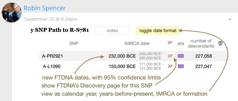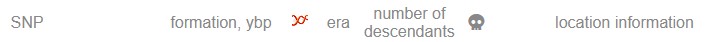 (Example) SNP Tracker now has the new FTDNA dates for all SNPs. As shown above, these are detailed in the SNP table, where you can see them as: