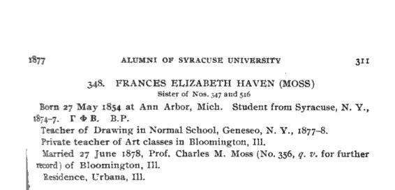 - Marriage*: Frances Elizabeth Haven married Charles M. Moss on Jun 27, 1878 at Syracuse, NY, USA.1