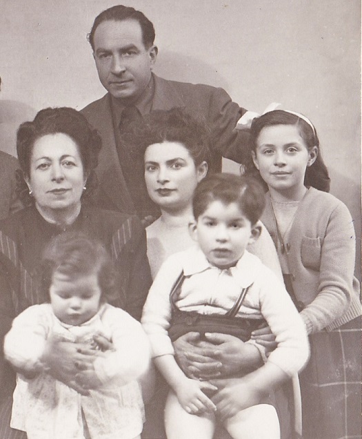 Raisel with the Garfinkiels in Paris, 1946. On laps, l to r: Simone, Emmanuel; seated: Raisel, Paula, Gisèle; standing: David.