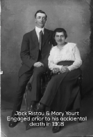 - [S412] Photographs viewed with Uncle Mac and Mom in 1995. B&W Photograph, These photographs were kept by Grandpa Fred Summach. They passed to Muriel Seymour on his death, and to Mac Summach on her passing. Uncle Mac had a battered old suitcase containing a badly worn photo album which may have been his mother's, as well as many loose photos. These are now in the possession of Colleen, Cheryl and possibly others. (2016), Uncle Mac Summach's Photo Archive digitized by Rick Moffat (Mesa, Maricopa County, Arizona, USA), MAC056 - Jack Ristau and Mary Yourt