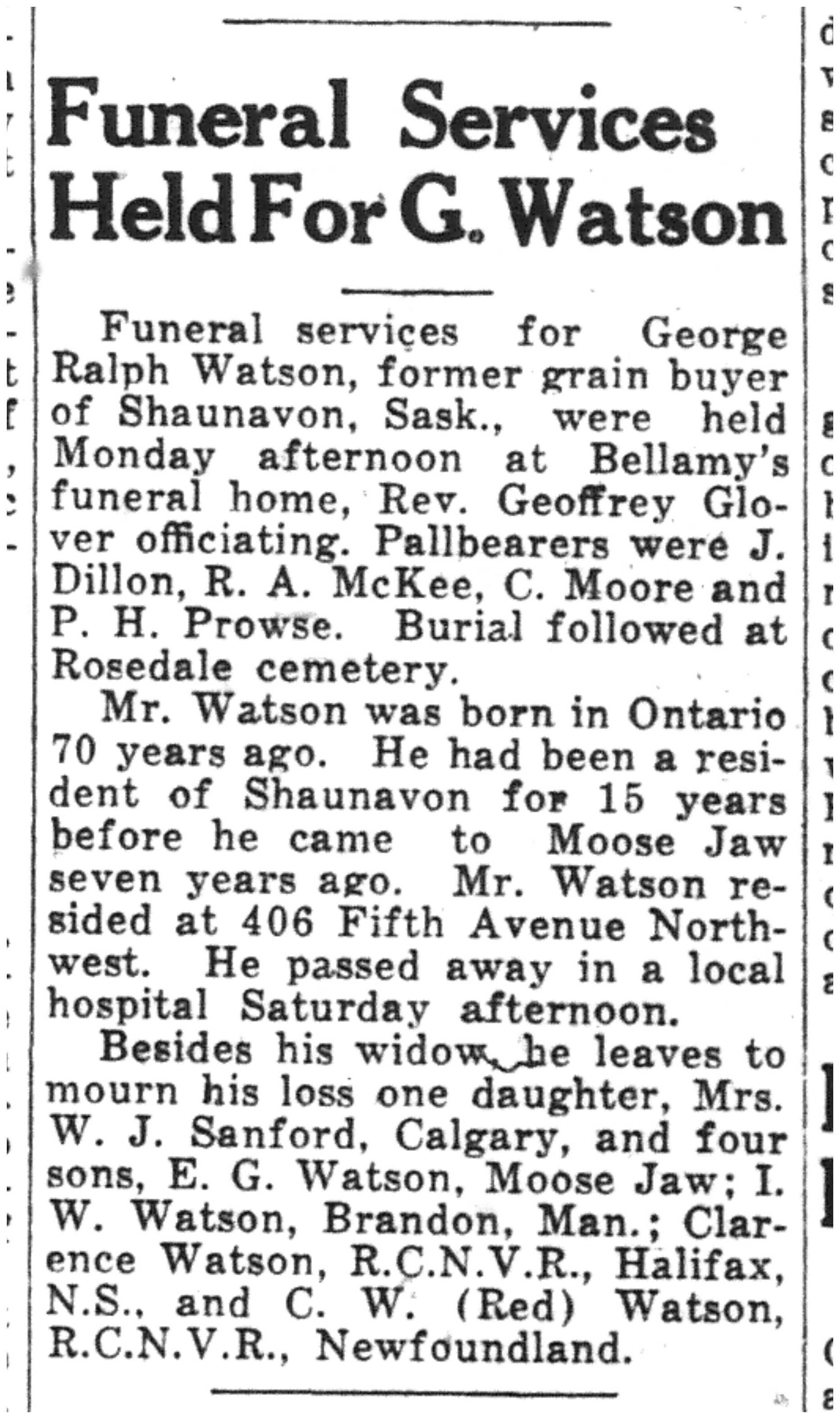 Funeral services for George Ralph Watson, former grain buyer of Shaunavon, Sask., were held Monday afternoon at Bellamy's funeral home, Rev. Geoffrey Glover officiating. Pallbearers were J. Dillon, R. A. McKee, C. Moore and P. H. Prowse. Burial followed at Rosedale cemetery. Mr. Watson was born in Ontario 70 years ago. He had been a resident of Shaunavon for 15 years before he came to Moose Jaw seven years ago. Mr. Watson resided at 406 Fifth Avenue North-west. He passed away in a local hospital Saturday afternoon. Besides his widow, he leaves to mourn his loss one daughter, Mrs. W. J. Sanford, Calgary, and four sons, E. G. Watson, Moose Jaw; I. W. Watson, Brandon, Man; Clarence Watson, R.C.N.V.R., Halifax, N.S., and C. W. (Red) Watson, R.C.N.V.R., Newfoundland.1