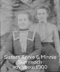 Ontario Death Registration 015166. - [S412] Photographs viewed with Uncle Mac and Mom in 1995. B&W Photograph, These photographs were kept by Grandpa Fred Summach. They passed to Muriel Seymour on his death, and to Mac Summach on her passing. Uncle Mac had a battered old suitcase containing a badly worn photo album which may have been his mother's, as well as many loose photos. These are now in the possession of Colleen, Cheryl and possibly others. (2016), Uncle Mac Summach's Photo Archive digitized by Rick Moffat (Mesa, Maricopa County, Arizona, USA), MAC038 "Sister Minnie now Mrs. Deznin and Sister Annie, Mrs. Tom Boland, Killaloe, Ont."