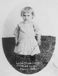 - [S412] Photographs viewed with Uncle Mac and Mom in 1995. B&W Photograph, These photographs were kept by Grandpa Fred Summach. They passed to Muriel Seymour on his death, and to Mac Summach on her passing. Uncle Mac had a battered old suitcase containing a badly worn photo album which may have been his mother's, as well as many loose photos. These are now in the possession of Colleen, Cheryl and possibly others. (2016), Uncle Mac Summach's Photo Archive digitized by Rick Moffat (Mesa, Maricopa County, Arizona, USA), MAC119 Lydia (Summach?)