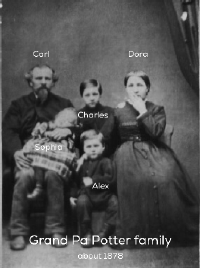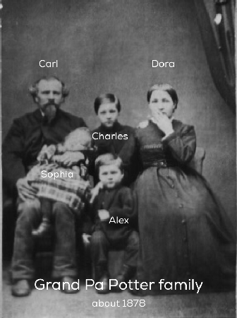Children are probably Charles, Alex and Sophia, so taken about 1878. - [S8304] A. C. Potter, 84, Dies in Edmonton, Edmonton Journal, Edmonton, Alberta, Jan 21, 1955, Page 24, column 6 viewed at Newspapers.com, Obituary: Alexander C. Potter. Hereinafter cited as Edmonton Journal.