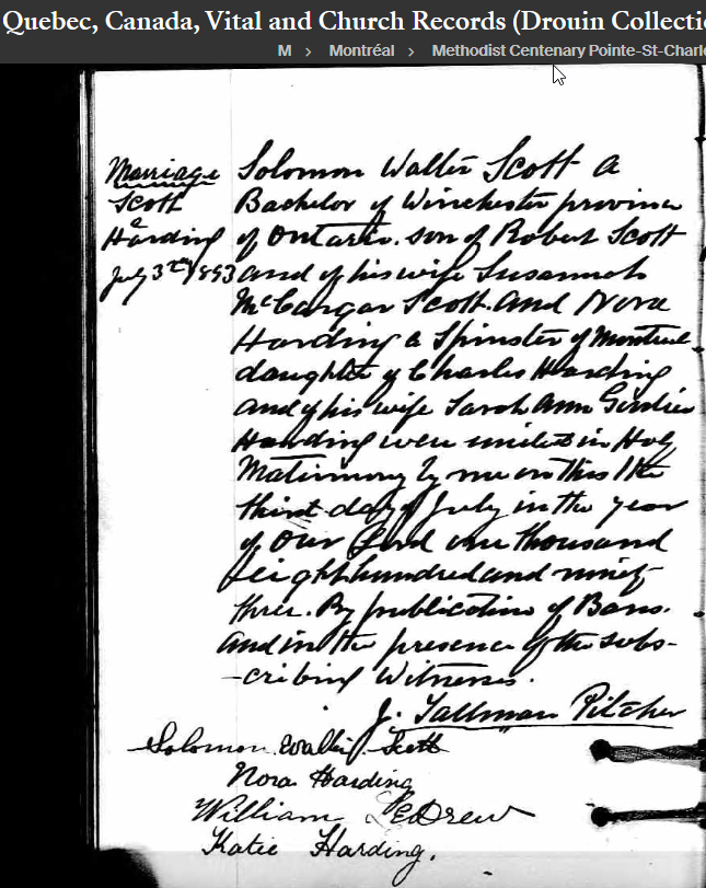 - [S1349] Ontario, Canada, Marriages, 1826-1942 (Publisher: Archives of Ontario, Toronto), Archives of Ontario, Ontario, Canada Marriages, 1785-1935; "Ontario, Canada, Select Marriages. Archives of Ontario, Toronto. This database includes images of the registrations. In some cases, alternative images in FamilySearch provide additional information"; cited as "Ontario Marriages, 1826-1942., James Forsyth (28) & Emma Scott (18); Marriage: 24 Oct 1900, Utterson, Muskoka District, Ontario, Canada, Groom's Parents: John Forsyth & Mary Dales, Bride's Parents: Robert Scott & Susan McCargar , Groom's Birthplace: Macaulay Twp. Bride's Birth Place: Dundas, Ontario,Groom's Occupation: Farmer, Registration #: 011288.