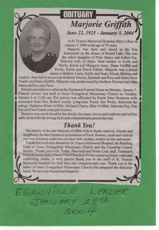 Marjorie Griffith obituary: Eganville Leader, January 28th, 2004, courtesy of Jean (Yourth) Panke: