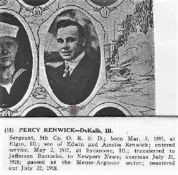 Percy J Renwick Illinois Ordnance Department World War I March 3 1891 - APril 3 1962. - [S12442] Percy Renwick Has Arrived Overseas, The Daily Chronicle, DeKalb, Illinois, 17 AUg 1918, Page 1, column 8 viewed at Newspaper Archive, Percy Renwick Overseas. Hereinafter cited as Daily Chronicle.