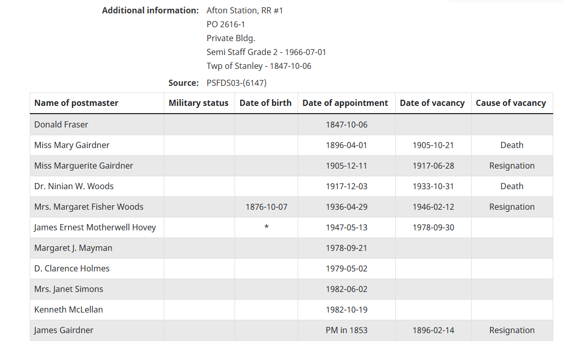 Mary Tudor Gairdner appeared on the 1891 Canadian Census of Bayfield, Stanley Twp., Huron County, Ontario in the household of her parents, James and Mary Gardiner.5 James Gairdner was postmaster of Bayfield from 1853 to 14 Feb 1896, when he resigned. He was followed by his daughters: Mary Tudor Gairdner (01 Apr 1896 to 21 Oct 1905) until her death and Margerette Gairdner (11 Nov 1905 to 28 June 1917) when she resigned.7