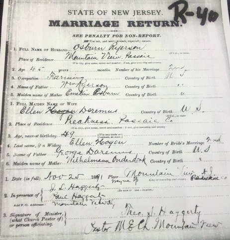 Ellen Doremus and Osburn Ryerson Marriage Certificate