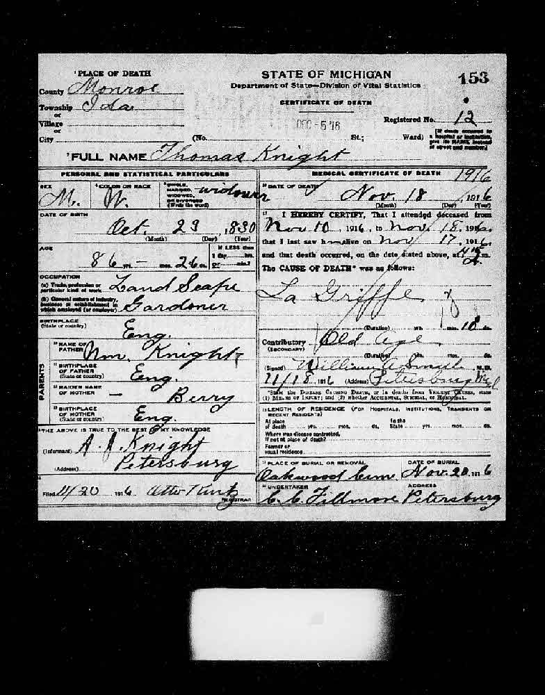 Thomas Knight Death Certificate