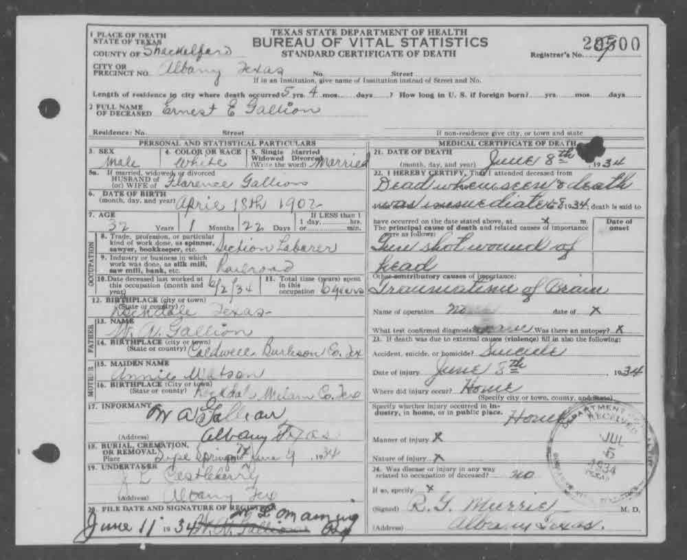 - [S293] http://pilot.familysearch.org/recordsearch/, Texas Death Certificate: Name: Ernest E Gallion