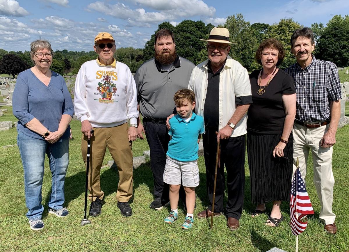 From left, Kathleen Shaw Decker, Vince Shaw, Ian Wisuri, Joseph Wisuri, Paul Wisuri, Elizabeth Shaw Antkowiak and David Antkowiak gather at the gravesite of Joseph Michael Shaw, Vincent's uncle and Paul's father, July 31 at St. Joseph Cemetery in Fleming.