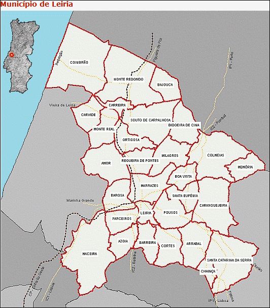 Leiria confrontando a Norte com a Freguesia de Marrazes, a Leste com a Freguesia de Pousos, a Sul com as Freguesias de Cortes e Barreira, a Leste com as Freguesias de Barosa e Amor. Fica enquadrada de forma aproximada pelos paralelos 39º43’ e 39º44’