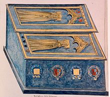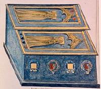 Eleanor's funeral took place in Westminster Abbey on 17 December 1290. Her body was placed in a grave near the high altar that had originally contained the coffin of Edward the Confessor and, more recently, that of King Henry III until his remains were removed to his new tomb in 1290. Eleanor's body remained in this grave until the completion of her own tomb. She had probably ordered that tomb before her death. It consists of a marble chest with carved mouldings and shields (originally painted) of the arms of England, Castile, and Ponthieu. The chest is surmounted by William Torel's superb gilt-bronze effigy, showing Eleanor in the same pose as the image on her great seal.