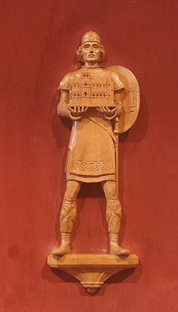 Here Olaf broke down Tamworth and a great slaughter fell on either side, and the Danes had the victory and led much war-booty away with them. Wulfrun was seized in the raid. Here King Edmund besieged King Olaf and Archbishop Wulfstan in Leicester, and he might have controlled them had they not escaped from the stronghold in the night.