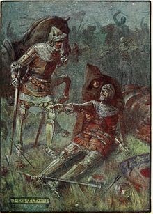 He also arranged a Safe conduct to visit the captive King David. Following this Douglas crossed with a large following to France and took up arms with Jean le Bon against Edward of Woodstock, the Black Prince. Douglas was present at the Battle of Poitiers where he was knighted by the French King. Douglas fought in the King's own Battle, but when the fight seemed over Douglas was dragged by his men from the melee. Froissart states that "... the Earl Douglas of Scotland, who fought a season valiantly, but when he saw the discomfiture he departed and saved himself; for in no wise would he be taken by the Englishmen, he would rather there be slain".[13] After the defeat there Douglas escaped, but left a number of his men either slain or captive, including his first cousin latterly the 3rd Earl of Douglas, Archibald the Grim.
