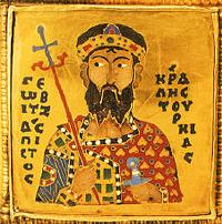 In early 1074, Géza had approached Pope Gregory VII to obtain international recognition of his rule. However, the pope wanted to take advantage of the conflict between Solomon and Géza and attempted to persuade both of them to acknowledge the suzerainty of the Holy See. Géza did not obey the pope and asked the Byzantine Emperor Michael VII Doukas for a crown. The emperor sent Géza a gold and enamel diadem, which bore the legend "Géza, the faithful king of Hungary" on one of its plaques. This "splendid work of art" became the lower part of the Holy Crown of Hungary by the end of the 12th century. Géza was crowned king with this diadem in early 1075. In this year he styled himself as "anointed king of the Hungarians by the grace of God" in the charter of the foundation of the Benedictine Abbey of Garamszentbenedek (present-day Hronský Be?adik, Slovakia).
