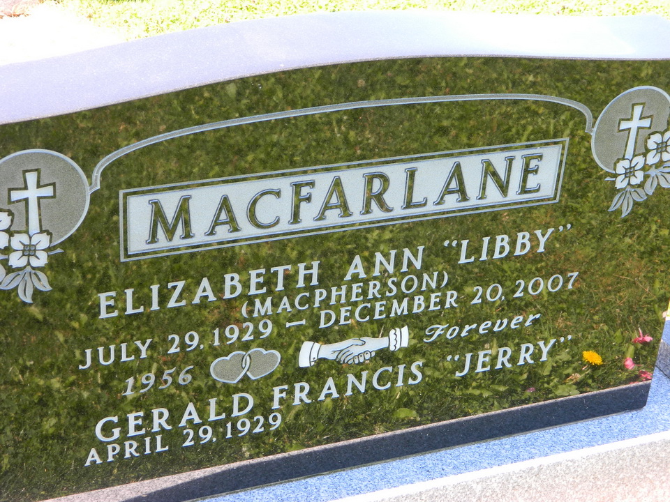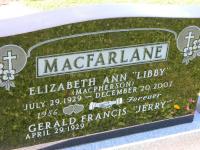 MacFARLANE, Elizabeth Ann "Libby" - Troy, died peacefully with her family at her side in Strait Richmond Hospital on December 20, 2007. Born in 1929, she was the daughter of the late Florence (MacLellan) and Daniel MacPherson. Libby is survived by her husband of 51 years, Gerald; daughters, Mary (Rick MacKinnon), Kathy and Karen (Lorne Foye), and granddaughter, Lauren. She is also survived by her sister-in-law, Jean MacPherson, and many nieces and nephews. She was predeceased by her sister, Mamie MacIsaac, and brothers, Jamie, Joseph (Percy) and Father Norman MacPherson. Libby was a long-time faithful member of Stella Maris Parish, Creignish. She was a devoted wife, mother and grandmother. Resting in Green's Funeral Home, 507 Bernard St., Port Hawkesbury, today from 2-4 and 7-9 p.m. Funeral mass will be Sunday, December 23, at 2 p.m. in Stella Maris Parish Church, Creignish. Donations may be made in Libby's memory to The Arthritis Society or the Palliative Care Program at Strait Richmond Hospital.2Family: Gerald Francis MacFarlane b. 29 Apr 1929, d. 14 Jan 2017