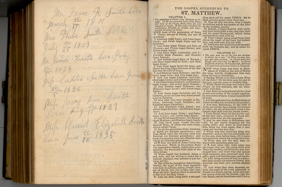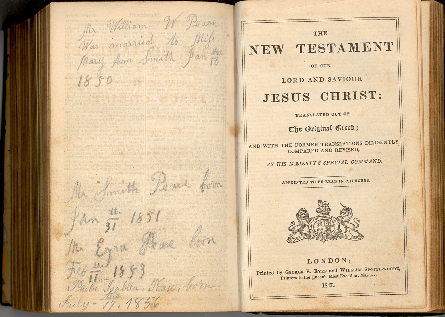 - [S1110] William W Pease and Mary Ann Smith Family Records, Mary Ann Smith Pease Bible (Printers to the Queen's Most Excellent Majesty, London: George Eyre and William Spottiswoode, 1847); Loretta Schumacher, Illinois, USA.