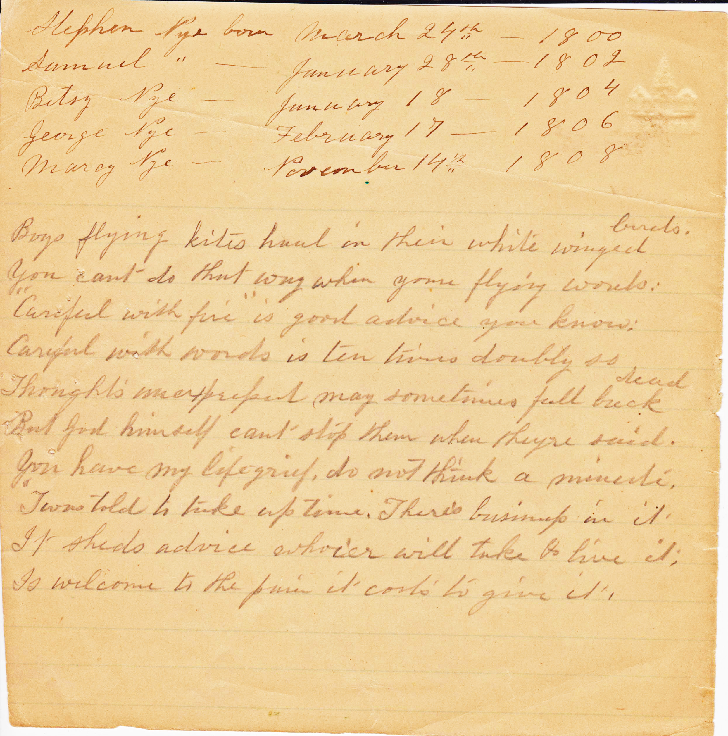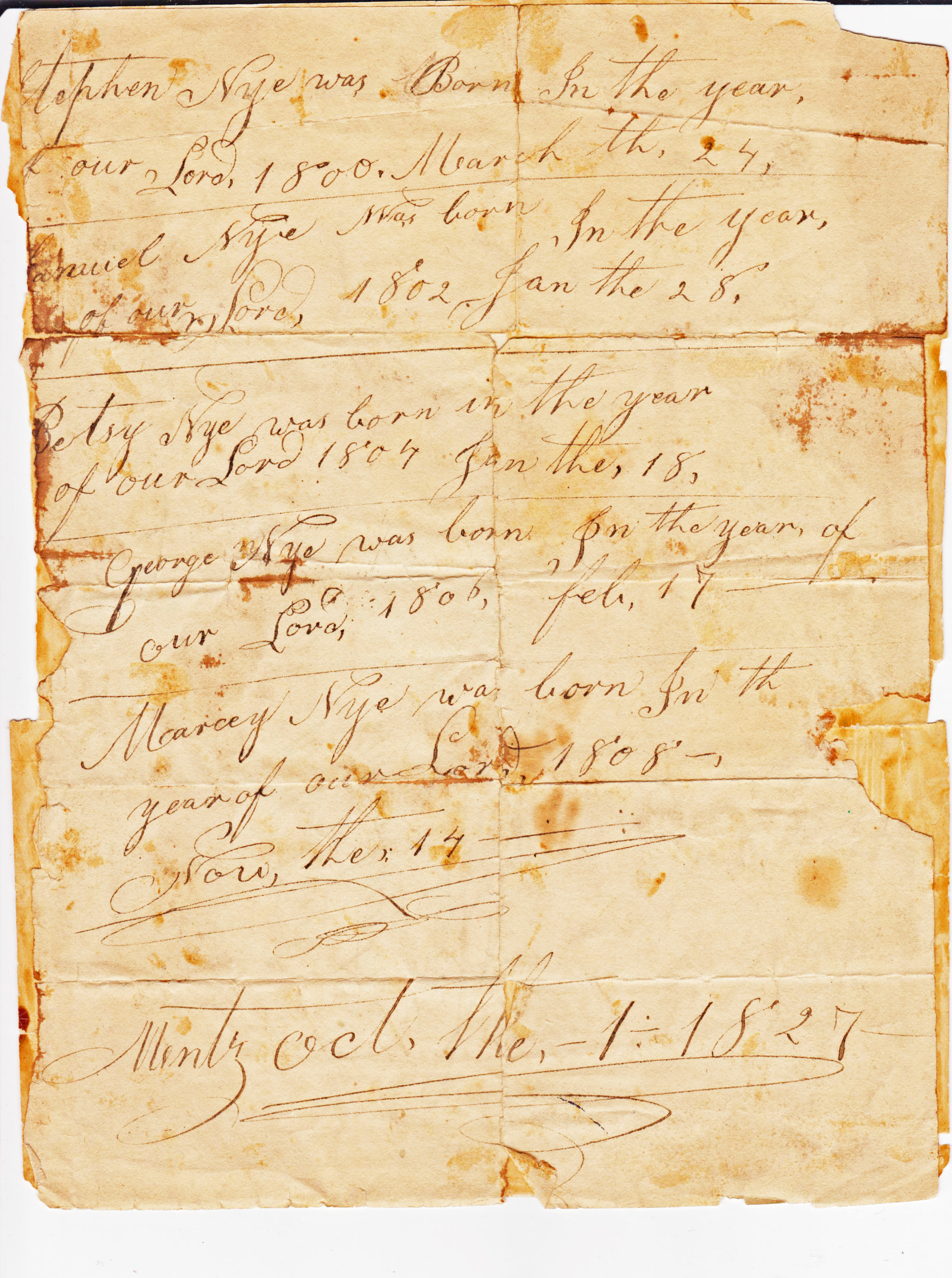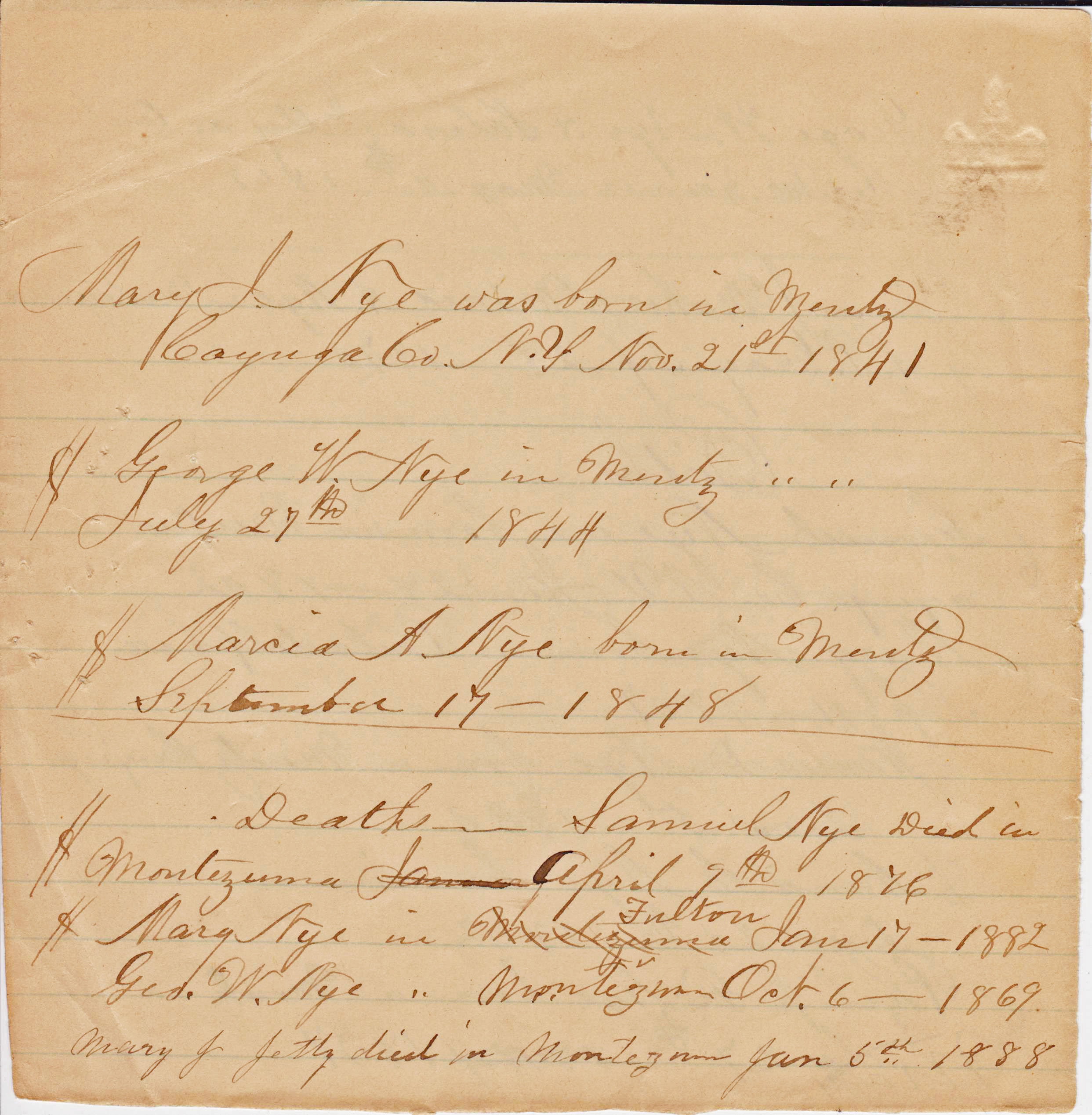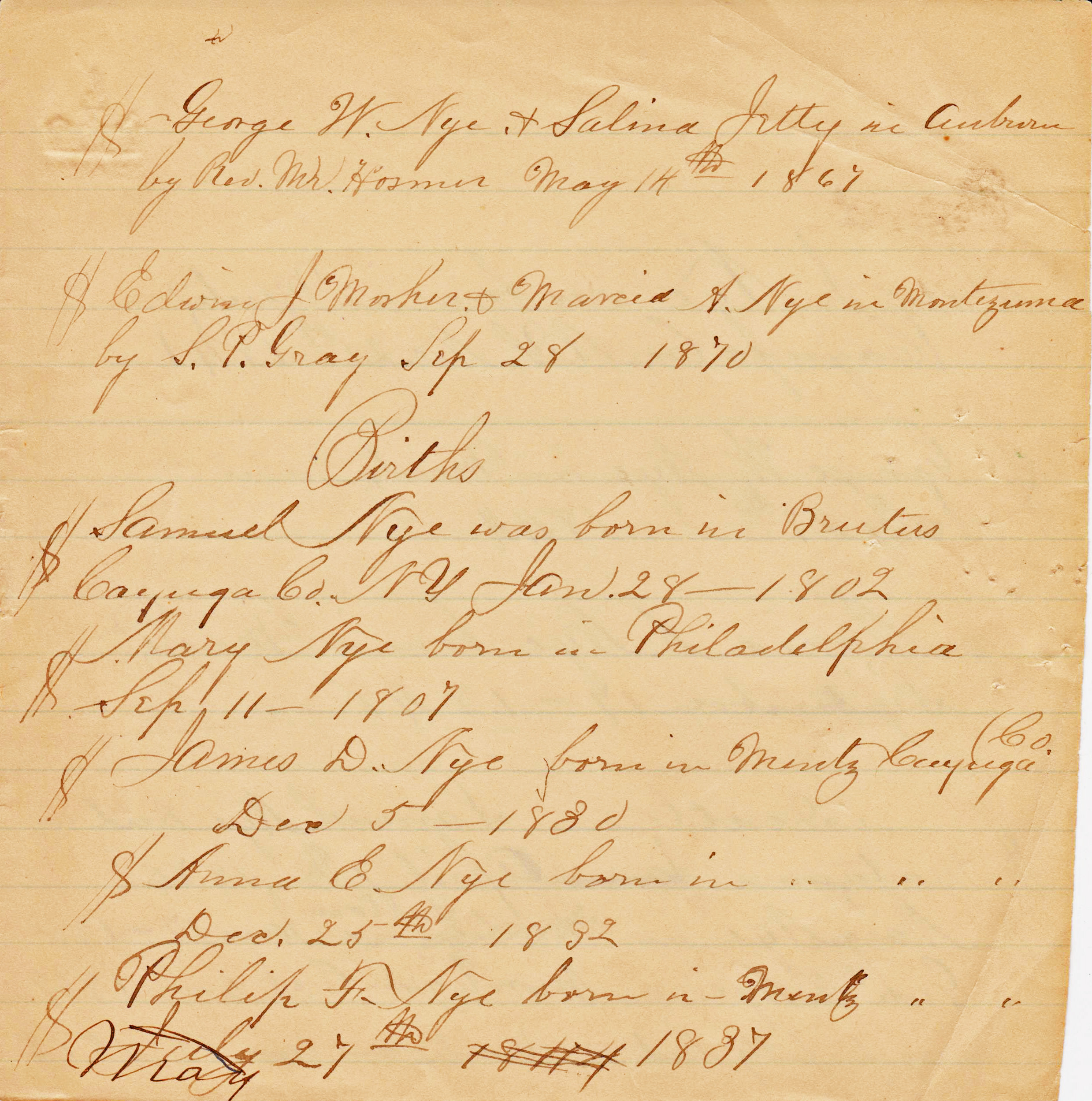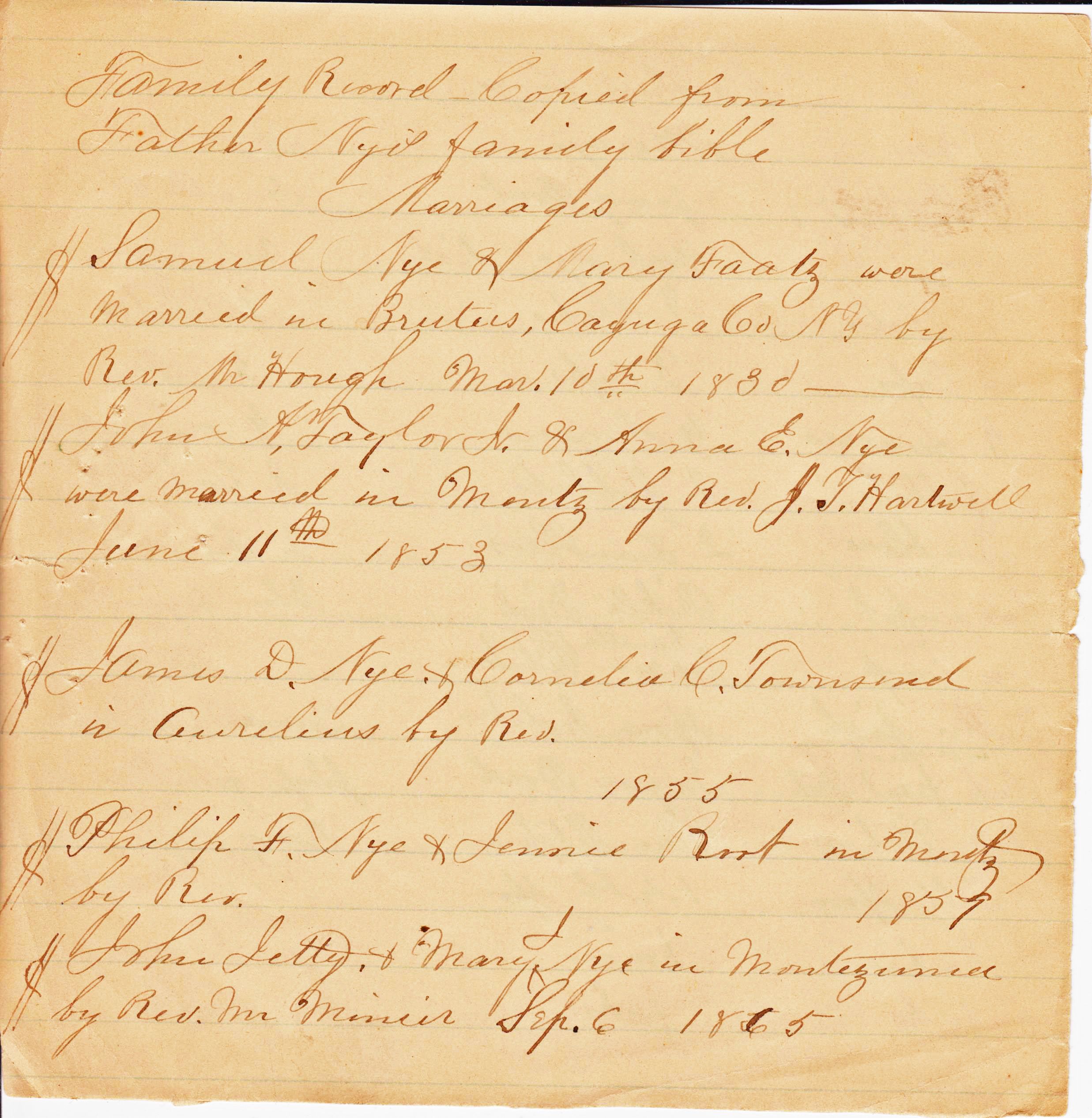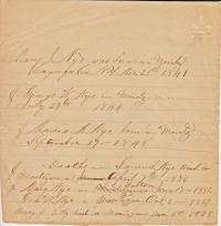 - [S1092] Unknown family info, Nye Family Bible Transcriptions (n.p.: n.pub., unknown publish date); Jessie-Jean Pustis, e-mail address.