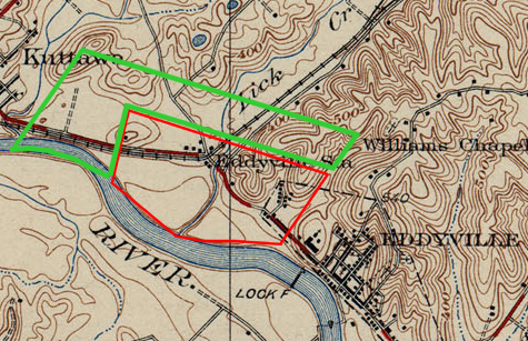 Gideon's 800-acre farm plotted on 1928 topo map