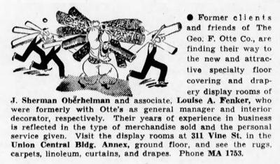 About 1937 she and J. Sherman Oberhelman, general manager, left the George F. Otte Co. and established a new business, at 311 Vine St.G. The business carried Oberhelman's name, but hers was prominently displayed as an associate in the firm's advertising.27,29,30