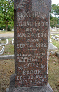 Marriage: 5 Oct 1865, Shelby Co., Tennessee, Matthew Lyddall Bacon (b. 24 Jan 1834, d. 5 Sep 1898)8,9,10