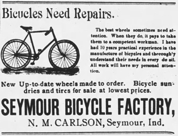 31. [S11585] Nels M. Carlson obituary, Seymour Daily Tribune, shows him as one of the organizers of factory, new type of bicycle, Tims Bicycle Company.